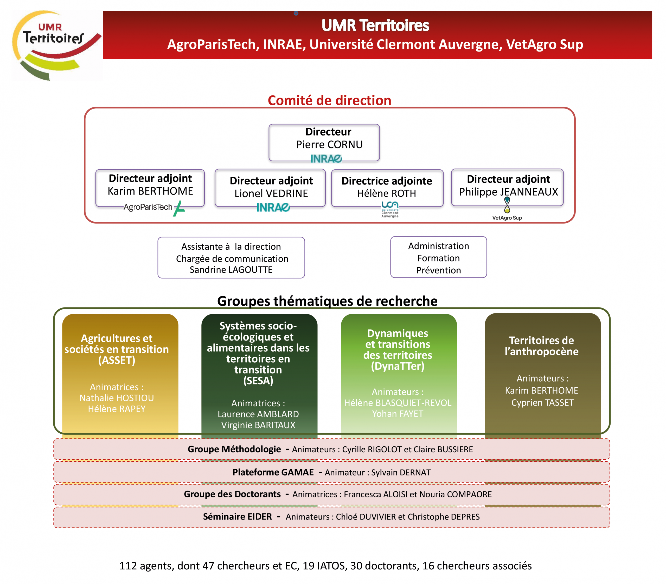 Les fonctions de direction sont assurées par un directeur et quatre directeurs adjoints représentant les 4 tutelles de l’UMR. Ils mettent en œuvre le pilotage stratégique de l’unité et gèrent les questions relatives à chaque tutelle (ressources humaines, gestion prévisionnelle des emplois et compétences, budget, contrats de recherche, liens avec les Départements et leurs composantes, etc.).